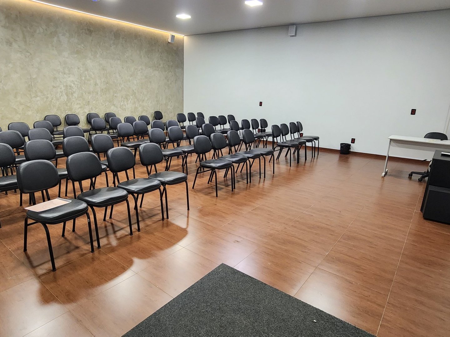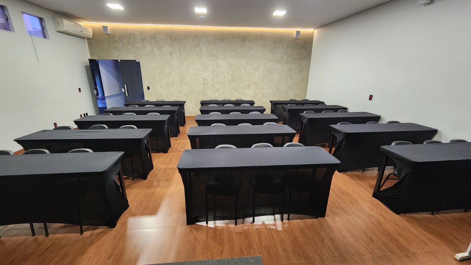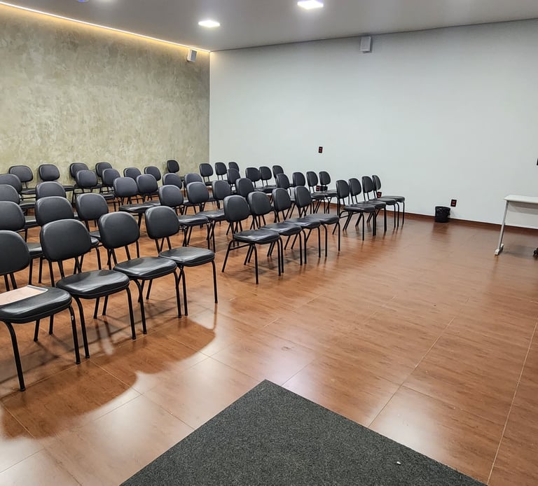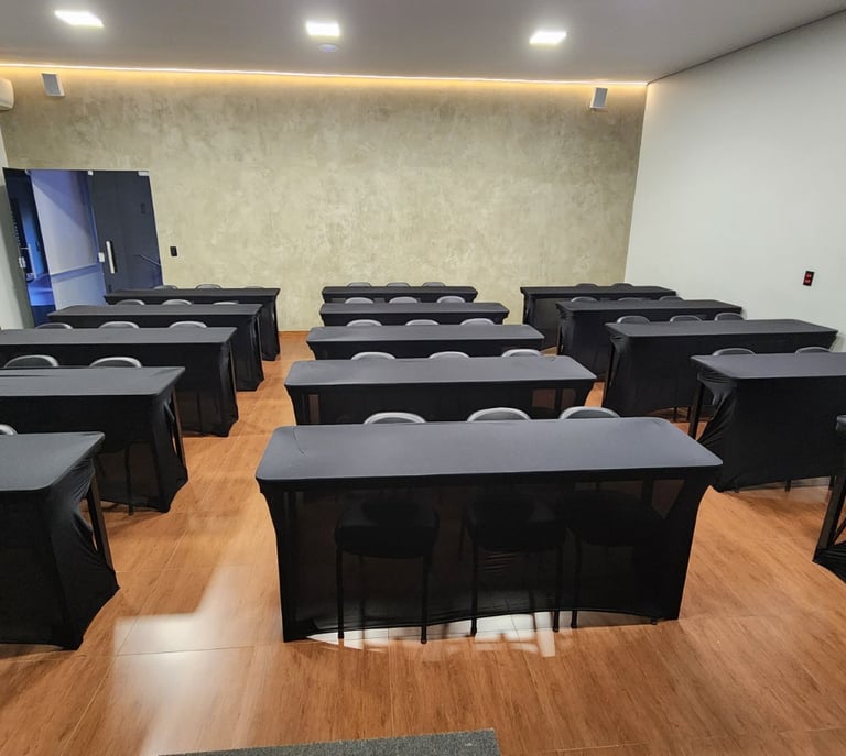 Ambiente preparado com mesas, ar-condicionado, Wi-Fi, projetor, som, microfone e palco.